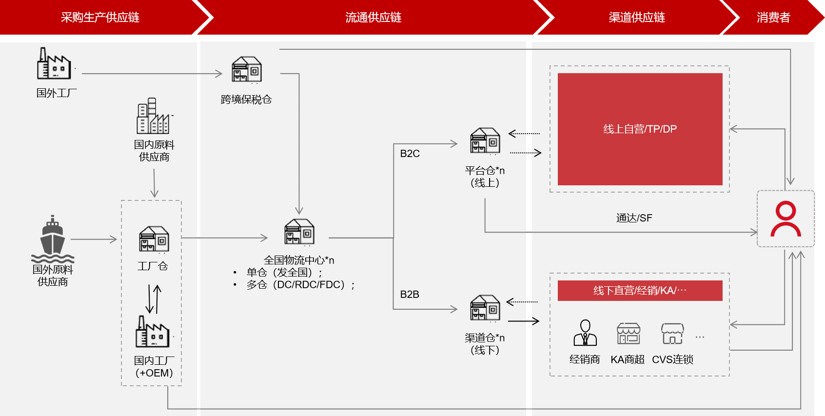 覆盖电商平台、直营店、DTC模式,提供B2B/B2C仓配一体服务,同时满足连锁门店、终端配送需求