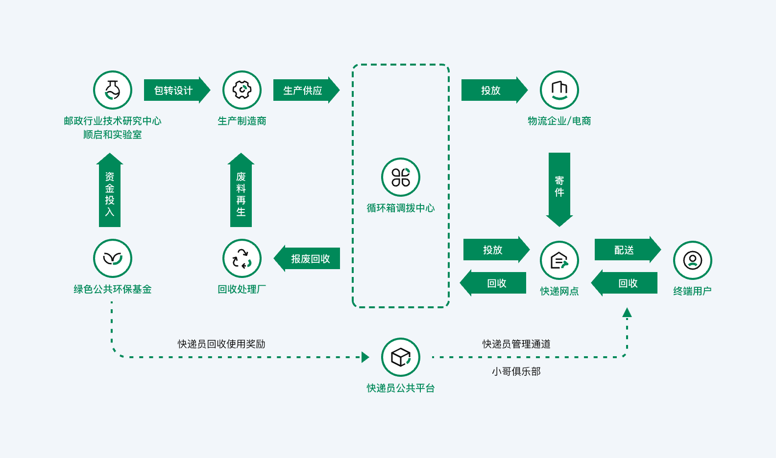 顺丰将创新深刻融入物流包装的各个环节,从包装设计、生产供应、调拨、回收、智能管理等多方面入手,联合各利益相关方打造快递包装循环生态圈,积极与上下游产业链合作,从包材制造商到物流企业,从消费者到回收企业,通过打通各个环节,推动绿色包装在全社会循环利用,践行循环包装全生命周期的绿色研发和绿色运营。